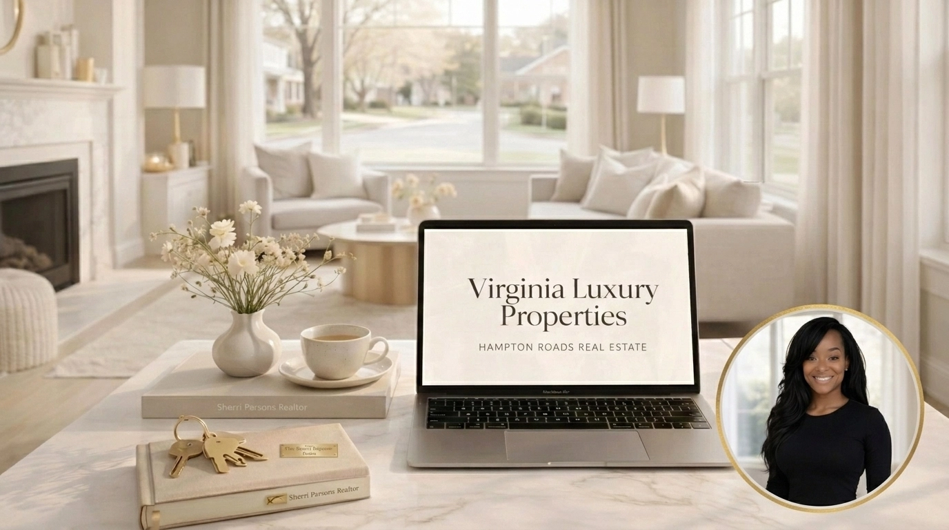 Luxury neutral Hampton Roads outdoor property scene with Sherri branding circle overlay
